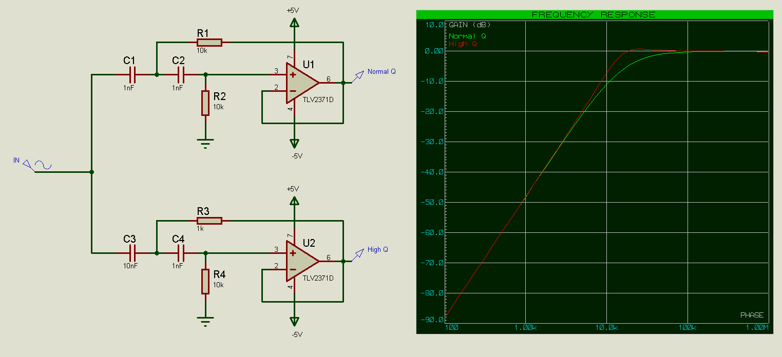 - Q > 1 will amplify the signal at the cutoff frequency.