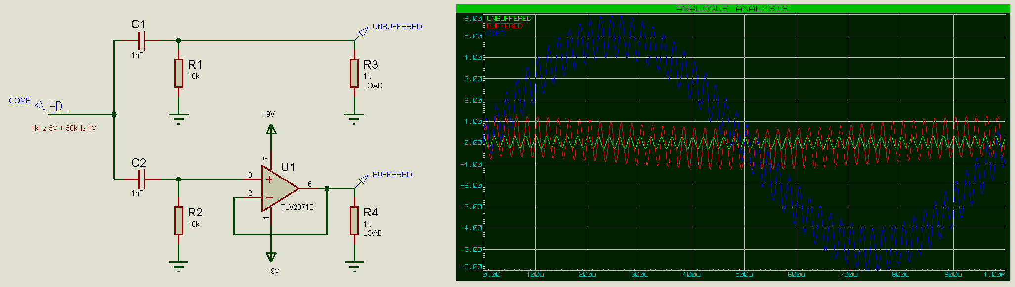 Note how the unbuffered output (green trace) is significantly attenuated compared to the buffered output (red trace).