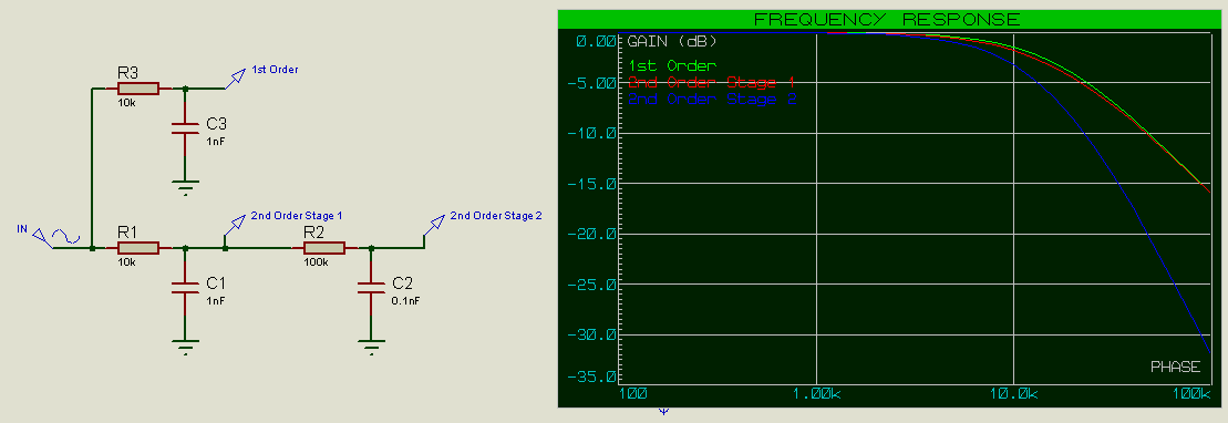 In this case we can see that Stage 1 of the 2nd order filter exactly matches that of the 1st order filter, and the cutoff frequency is 15.9kHz as expected.